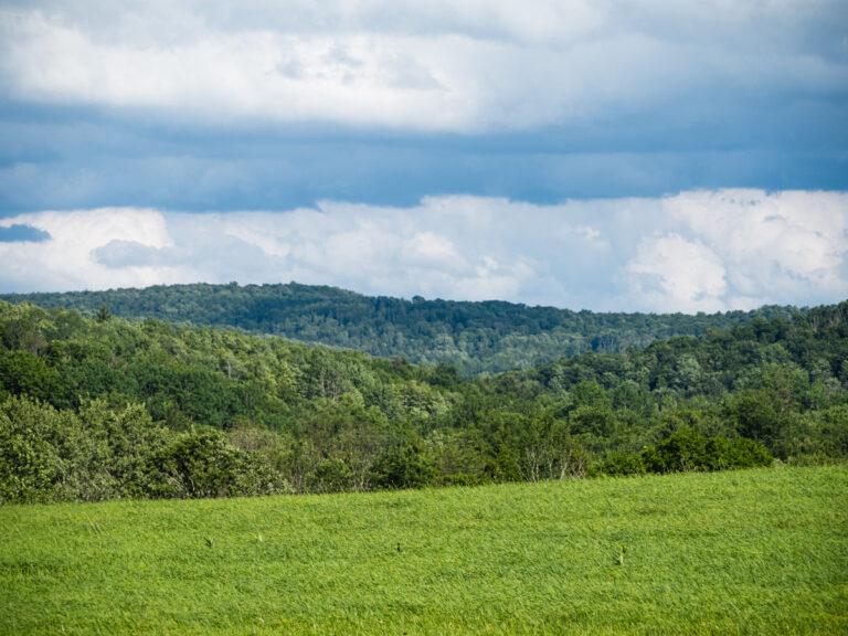 Stacked ridges of the Endless Mountains from beyond one of the high fields at Salt Springs, all under an ominous summer sky. It was the