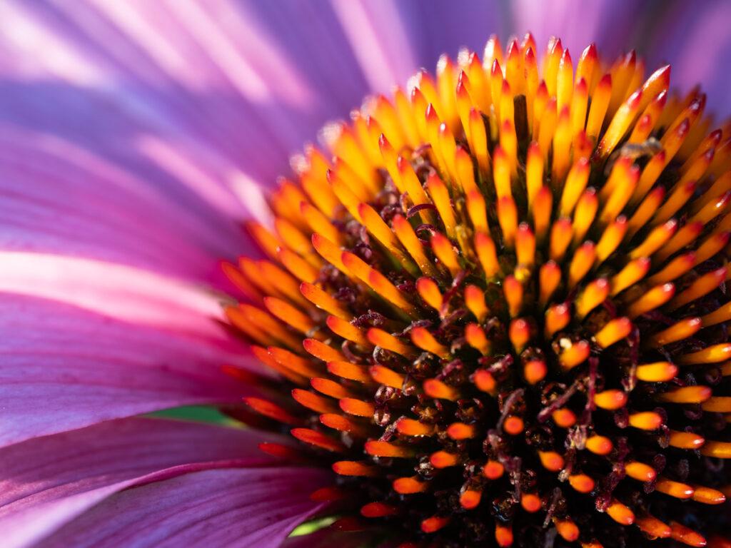 The macro world unlocks all manner of details and secrets that go unnoticed, and offers a delightful range that includes semi-abstract art as well as scientific documentation. This photo of a coneflower blossom is surely aligned with the former; at such close range it becomes a study in light, shadow, and color.