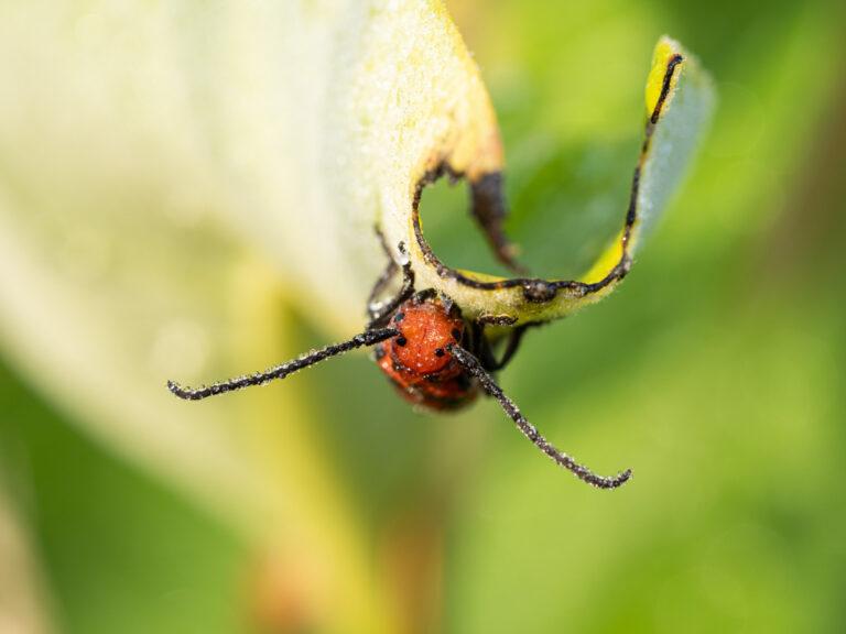 This head-on portrait highlights a red milkweed beetle, a ubiquitous resident on milkweed plants beginning in midsummer, and from that point onward I doubt there