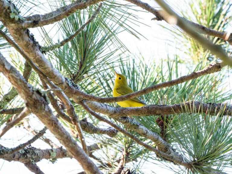 It isn’t a pine warbler, but a warbler in a pine – a yellow warbler, by my identification, and possibly a juvenile male based on